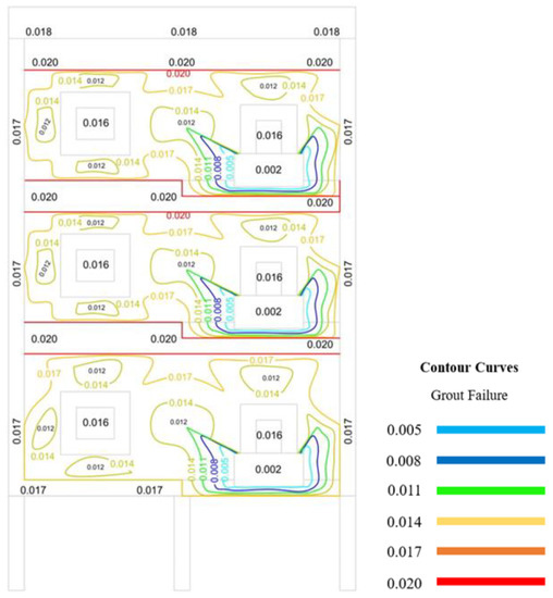 Regarding the probability of occurrence of grout failure in ceramic claddings by region (Figure 10 and Figure 11), the sensitivity map reveals a higher sensitivity for the regions of transition between floor (0.020) and top of the building (0.018). The transitions between the floors, the top, and the borders and corners present the higher occurrences of anomalies in level 3. These regions are particularly affected by differential movements, whose concentrated stresses are absorbed by the cladding joints. In this sense, the main reasons for the prevalence of grout failure in these regions are the inadequate dimensioning of joints (e.g., insufficient or with inadequate width), the adoption of inadequate grout filling materials, and the absence of regular maintenance actions [47]. The sensitivity of the top region is associated with a high exposure to weather agents, such as solar incidence and UV radiation exposure and driving rain, whose cumulative effects over time tend to increase the occurrence of grout failure defects [46,47,48,49].