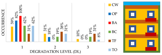 The results of the occurrence of cracking in ceramic claddings (Figure 8 and Figure 9) reveal that the top region of the building presents a higher sensitivity to cracking (0.178). This region is more subjected to differential movements by thermal expansion due to high solar incidence and exposure to rain that promote the occurrence of cracks [44,45]. When analysing the highest degradation level (Figure 8), the higher occurrence of cracking in level 4 occurs for the regions of transition between floors (TF), for the top of the building (TO), and for the borders and corners (BC), which can be also justified by the concentration of loads in these regions [15]. Several researchers [7,11,46] suggest that, despite their high incidence on the façade, cracks are anomalies that tend to stabilize after their occurrence. Nevertheless, cracks due to shrinkage or expansion movements of various natures tend to occur in regions of higher defect concentration, being a headway to other eventual future anomalies.