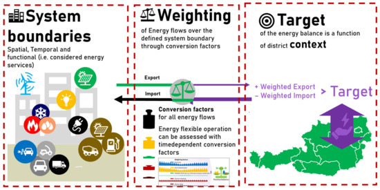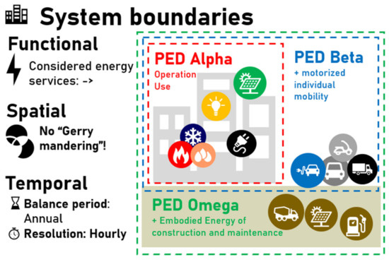 System boundaries are considered in a spatial, temporal, and functional sense in accordance with the fundamentals of PED energy modeling described in [11]. The definition of system boundaries is required to enable the balancing of flows over these defined boundaries. As such, it is necessary to distinguish and define all three different types: