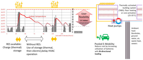 How can this energy flexibility be provided? The physical principles presented in IEA EBC Annex 67 on energy-flexible buildings [37] (p.67) apply: In particular, the thermal storage masses of buildings and districts with good thermal insulation and heavy building components can lead to significant displacement periods of several days, during which the system can freely choose the timing of its energy use for heating and cooling [38]. The principle is schematically summarized in the following Figure 3. The DSM operation is included and assessed in the energy balance by lowering the associated weighting of energy import during times of regionally available surpluses.