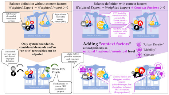 What is typically not discussed at length is the goal and scope of the definition: is it suitable for green or brown field developments, any climate zone, and density? Should it be possible for any district, and of which ambition level to achieve a “PED”? As with other European standardization processes such as the Energy Performance of Buildings directive (EPBD [20]), one could separate what a PED is in different levels of regionality from European, national, and municipal all the way down to project-specific. In practice, however, most definitions are developed in international or national projects but used mostly by the districts within that project. This further adds to the conundrum of which definitions can and should be used for which PED projects, and most importantly: why. In fact, using multiple different definitions on different levels of regionality and detail, from broad European frameworks through national standardizations to project-level specification could be a promising way forward. In the meantime the need to bridge the gap between a standardized and unambiguous definition for EU reporting on one side and the flexibility to account for local contexts and feasibility on the other has become abundantly clear [4,7]. This paper aims to add to the theory underpinning PED definitions by introducing a conceptual view on the positive energy balance, in which the assumed target of positivity can be calibrated by the use of so-called “context factors” (CF for short). These are virtual balance components that need to be designed district-independently to maintain PED feasibility in the desired context.