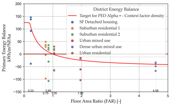 Figure 6 shows example energy balances of a number of districts in Austria that also show the impact of building density on the spread of the primary energy balance of districts. The vertical spread is caused by the different variants of a district (of constant density), from conventional variants without local renewable generation and efficiency measures at the lower end of the spectrum to “maximum” variants at the upper end, which feature highly efficient thermal hulls and HVAC systems with heat pumps for low-temperature heating and cooling and DHW heating and consider energy-flexible DSM and the maximum technical PV potential. The latter was determined on a project-specific basis, which inhibits a direct comparison between the maximum and minimum district variants. However, the representation of all analyzed district variants as one point on this FAR-to-PE balance diagram shows the connection with the building density and the target value derived from it. The red line represents the proposed context factor density as a modified target.