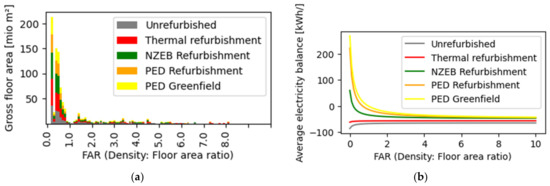 Figure 8 shows the size and distribution of the defined district typologies depending on their density (a) and their respective energy balance target (b). This allocation can be tweaked to reflect other scenarios of building sector performance in a future energy system by changing the balance target of −22.7 PJ/a. It can also serve as grounds for discussion as to the relative performance and effort sharing of different parts of the building stock.