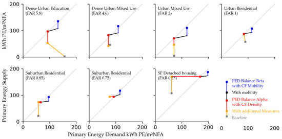 Primary energy balances of example districts over their density (FAR).