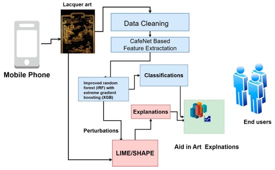 A mobile phone can be used to take pictures of any lacquer art. The taken picture is sent to the data cleaning software, where the data cleaning operation can be performed, such as data normalization and resizing for better processing speed and applying the CafeNet model for feature extractions. The extracted features are passed to the random forest model to classify what type of art it is. Finally, the classified results are passed to LIME and SHAPE to explain the images.