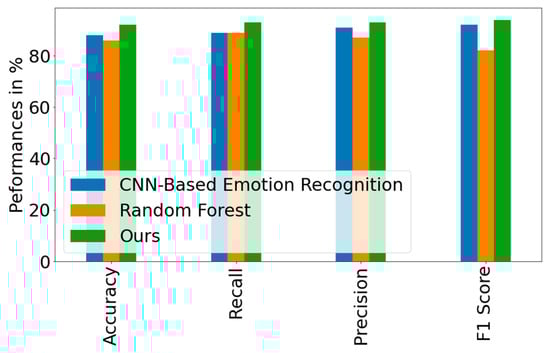 Figure 5 depicts the performance comparisons of the proposed approach with the existing model. Based on the performance comparison data, we can see that the proposed model outperforms the CNN-Based Emotion Recognition model and the random forest model in all four evaluation metrics: accuracy, precision, recall, and the F1 score. Specifically, the proposed model has an accuracy of 92%, higher than the CNN-Based Emotion Recognition model’s accuracy of 88% and the random forest model’s accuracy of 86%. In terms of precision, the proposed model has a precision of 93%, which is higher than both the CNN-Based Emotion Recognition model’s precision of 89% and the random forest model’s precision of 89%. Regarding recall, the proposed model has a memory of 93%, which is higher than both the CNN-Based Emotion Recognition model’s recall of 91% and the random forest model’s recall of 87%. Finally, the proposed model has an F1 score of 94%, higher than the CNN-Based Emotion Recognition model’s F1 score of 92% and the random forest model’s F1 score of 82%. Based on these metrics, this result shows that the proposed is more effective for emotion recognition than the other two models.