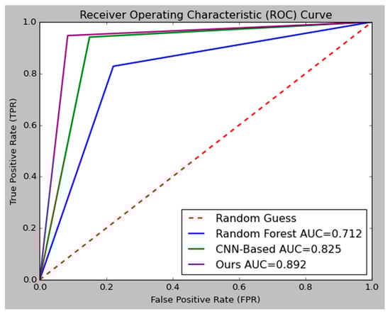 A ROC (Receiver Operating Characteristic) curve is a graphical representation of the performance of a binary classifier system. It plots the true positive rate (TPR) against the false positive rate (FPR) at various threshold settings. The area under the ROC curve (AUC) is a widely used metric to evaluate the performance of a classifier system. A higher AUC value indicates a better performance of the classifier. Figure 6 depicts performance comparisons using a ROC curve.