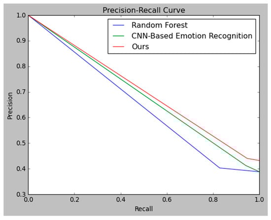 Figure 7 shows the PR curve comparisons of all three methods. The AUC value for CNN-Based Emotion Recognition is 0.825. This means the classifier system based on CNNs distinguishes between positive and negative samples. The AUC value for random forest is 0.712. This means that the classifier system based on the random forest algorithm performs similarly in distinguishing between positive and negative samples as the CNN-based system. The AUC value for the proposed model is 0.89. This means that the classifier system performs significantly better in distinguishing between positive and negative samples than both CNN-Based Emotion Recognition and random forest, with a TPR of 0.89 and an FPR of 0.11. Overall, the AUC values suggest that the proposed model outperforms both CNN-Based Emotion Recognition and random forest in distinguishing between positive and negative samples. Figure 7 depicts performance comparisons using a PR curve.