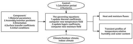 The calculation process of simulation is demonstrated in Figure 1. The necessary input data include detailed information about the examined building components, such as the assembly of the wall layer and orientation. It is also important to provide accurate initial conditions, material parameters, and climatic conditions to ensure the simulation accurately reflects real conditions. These input data are crucial for generating reliable results and making informed decisions related to building design and energy efficiency.