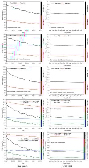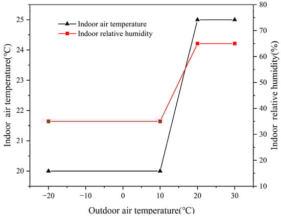 In the simulation process of WUFI Pro, the indoor temperature and humidity conditions were determined by the outdoor air temperature, as shown in Figure 2, according to EN 15026/WTA6-2 []. Because the meteorological data of typical cities in the five major climate zones of China were not available in the database, this study selected cities that meet the corresponding conditions in the North American meteorological database according to the Chinese standard GBT50176-2016 [], and the principles of these city selections and the temperature and relative humidity of these cities are shown in Table 3 and Table 4.