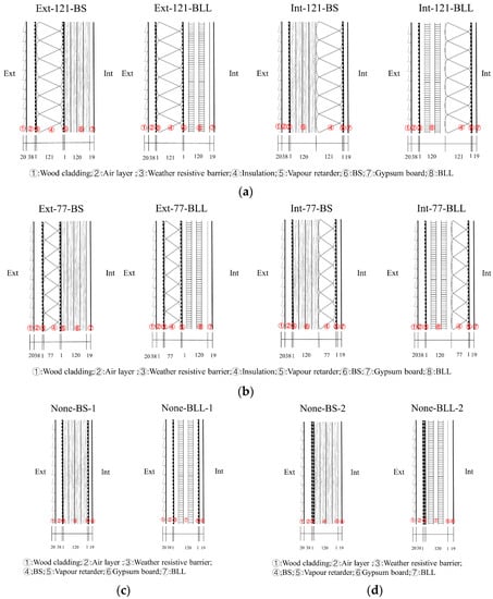 This study aims to propose hygrothermal performance walls suitable for five major climate zones in China. Wall details of BLL and BS frame structures were constructed. Figure 3 shows the configuration of each wall layer.