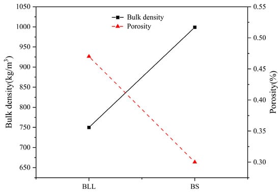 As shown in Figure 4, the bulk density of BS is higher than that of BLL, while the porosity is the opposite. This is because the bonding pressure in the production process of BS is higher than that of BLL, resulting in a more compact compression of BS. In general, porosity and bulk density are inversely proportional.