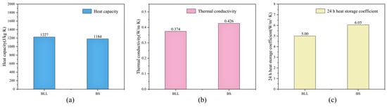 The thermal properties of BS and BLL. (a) Specific heat capacity; (b) Thermal conductivity; (c) 24 h thermal storage coefficient.