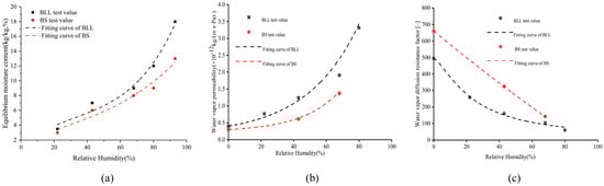 As shown in Figure 6, the isothermal sorption curve of BLL and BS exhibit similar trends, with BLL showing relatively higher moisture sorption capacity. At the same level of relative humidity, BLL can absorb more water, resulting in a higher equilibrium moisture content. BLL has a higher vapor permeability coefficient and lower water vapor diffusion resistance coefficient under various relative humidity conditions compared to BS, indicating that BLL is more easily permeated by vapor than BS.