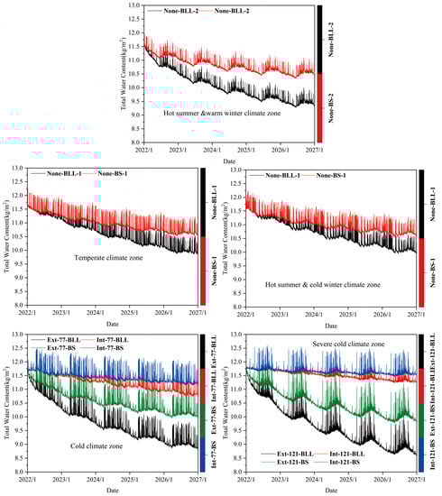 In the temperate climate zone, the risk ratio of wall None-BLL-1 of BLL was 0.80%, and the risk ratio of wall None-BS-1 of BS was 3.11%. In the hot summer and cold winter climate zone, the risk ratio of wall None-BLL-1 of BLL was 1.24%, and the risk ratio of wall None-BS-1 of BS was 3.40%. In the hot summer and warm winter climate zones, the risk ratio of wall None-BLL-2 of BLL was 0.69%, and the risk ratio of wall None-BS-2 of BS was 1.26%. Results show that the four walls had a low risk ratio in the three climate zones. In the cold and severe cold climate zone, wall Int-121-BLL and Int-77-BLL had a maximum risk ratio of 5.86%, and the risk ratio of the rest of the walls was less than 4.00%, which confirms that the eight walls have a low long-term risk of mold growth in the remaining climate zones.