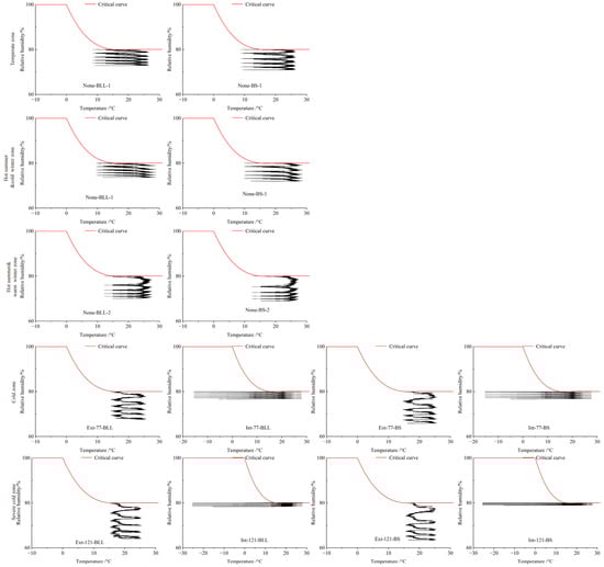 Based on temperature and relative humidity, the risk of mold growth was assessed. The Lowest Isopleth for Mold Growth (LIM) curve is a critical curve that indicates the minimum RH at which the mold can germinate at each temperature. Table 6 shows the risk criteria for mold growth based on the LIM curve. In this study, temperature and relative humidity were recorded hourly and compared to the LIM curve to assess mold growth risk. This study calculated the number of points above the LIM curve, i.e., the number of hours with mold risk as a percentage of the total simulation time (43,800 h), which was used to more visually describe the probability of mold risk.
