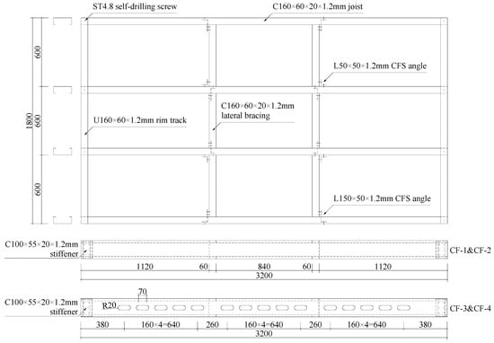 All specimens were 3200 mm long and 1800 mm wide with a 600 mm joist spacing. The joists with a section of C160 × 60 × 20 × 1.2 mm (height × width × lip length × thickness) were framed into an 1800 mm long U160 × 60 × 1.2 mm (height × width × thickness) CFS U-shape rim track at each end, and were fastened by ST4.8 self-drilling screws with an edge distance of 30 mm. To avoid possible local failure of end supports under a concentrated reaction, CFS stiffeners with a section of C100 × 55 × 20 × 1.2 mm were fastened to the web at each end of the joists with six ST4.8 screws. In addition, lateral bracing with a section of C160 × 60 × 20 × 1.2 mm was arranged at the trisection point and connected to the joists by ST4.8 screws and CFS angle steel. The general configuration of CFS framing is illustrated in Figure 1, while connection details are shown in Figure 2.