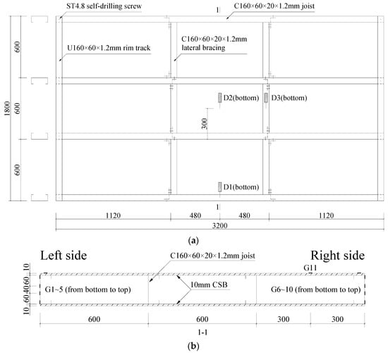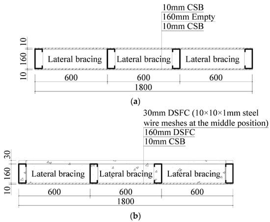 Wood-based boards, such as oriented strand boards (OSBs), have been used to resist compression in CFS composite floors as structural sheathings, in addition to concrete. Xu et al. [10] investigated the vibration performance of lightweight residential floors supported by CFS C-shape joists sheathed with OSBs, while Zhou et al. [11] focused on flexural capacity and proposed a simplified evaluation method. Kyvelou et al. [12] conducted a series of four-point bending tests to examine the overall behavior and shear transfer mechanisms of self-drilling screws and structural adhesive, while Li et al. [13] proposed a new type of lightweight I-section bamboo–steel composite beam utilizing adhesive bonding.