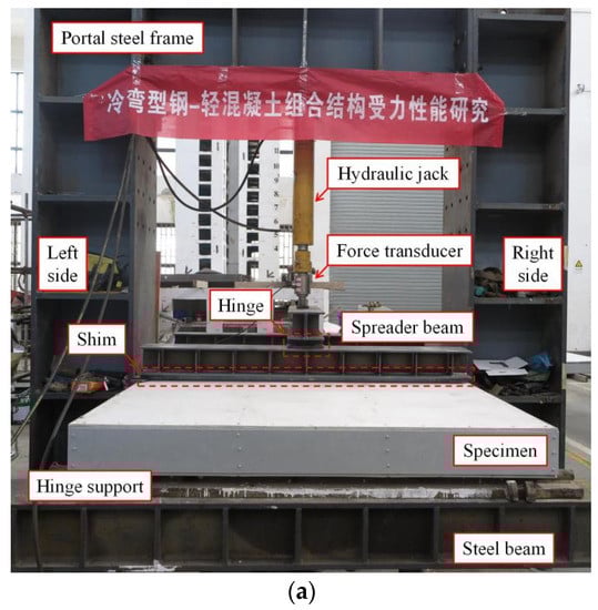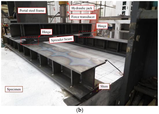 In this study, two concentrated loads were applied at one-third of the span length to induce a pure bending moment on the mid-span of the composite floor for investigating its flexural behavior. The test set-up is shown in Figure 7. Steel blocks and steel beams were used as rigid supports, with hinge supports fixed on top to achieve simply supported boundary conditions. The specimen was supported on hinge supports at both ends, with a support length of 3000 mm. The loading width was controlled by shims to be 100 mm. A hydraulic jack was used for loading. Reaction forces were provided by the portal steel frame, and load distribution was achieved through spreader beams and hinges.