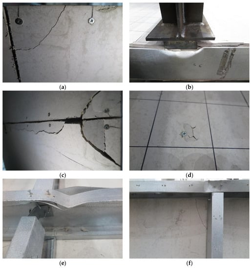 During the initial loading stage, there was no apparent experimental phenomenon. When loaded up to 40 kN, corner cracks appeared at the screw connections of the joint between the bottom CSBs (Figure 11a). When loaded up to 50 kN, elastic buckling deformation occurred throughout the entire length of the CFS joists (Figure 11b); when loaded up to 60 kN, the buckling deformation intensified (Figure 11c).