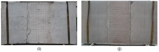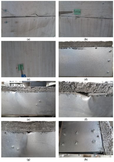 During the initial loading stage, there was no apparent experimental phenomenon. When loaded up to 60 kN, cracks appeared around screw connections (Figure 10a); when loaded up to 80 kN, the cracks extended to both sides and connected (Figure 10b). At the same time, there were obvious tensile cracks in the bottom CSB (Figure 10c); when loaded up to 90 kN, the cracks further developed, and the bottom CSB gradually stopped working.