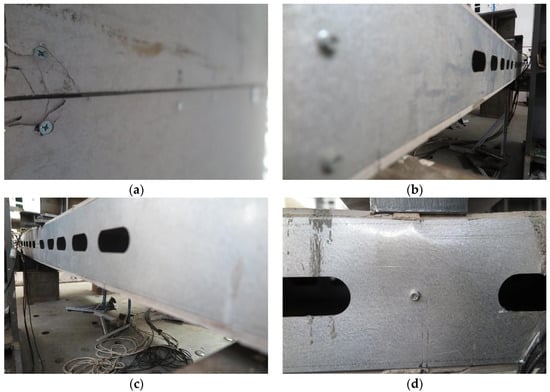 The layouts of CSBs and self-drilling screws are depicted in Figure 3. The section details of the specimens are shown in Figure 4. For specimens CF-1 and CF-2, CSBs were placed on both the top and bottom flanges and connected using ST4.8 self-drilling screws with a spacing of 140–150 mm. For specimens CF-3 and CF-4, CSBs were only placed on the bottom flanges to serve as formwork. DSFC was cast in and covered the top flange up to 30 mm. It should be noted that 10 × 10 × 1 mm steel wire meshes were embedded at the middle position of the top 30 mm DSFC to limit crack expansion.