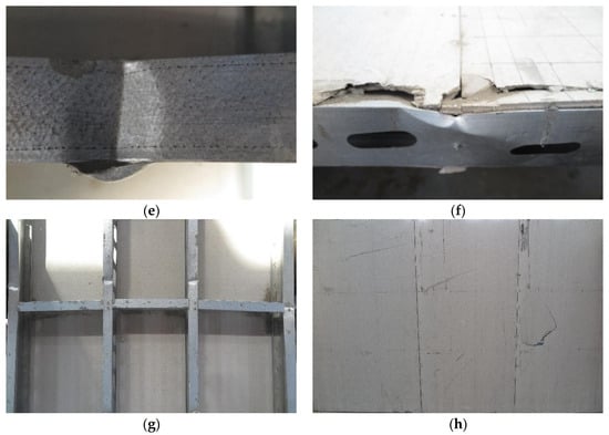 When loaded up to 64.8 kN, local crippling occurred under the loading point of the CFS joist (Figure 11d). As the subsequent loading under displacement control progressed, the web crippling further intensified, resulting in the tearing of the CFS at the cold-formed position (Figure 11e) and crushing of the CSB under the spreader beam (Figure 11f). The final failure forms of the cold-formed thin-walled steel joists and the bottom CSB are shown in Figure 11g,h, respectively.