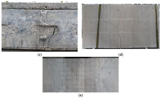 Failure phenomena of CF-4; (a) separation between CFS and DSFC; (b) cracks around screws; (c) tensile fracture of CFS and DSFC; (d) joint cracks; (e) arched cracks.