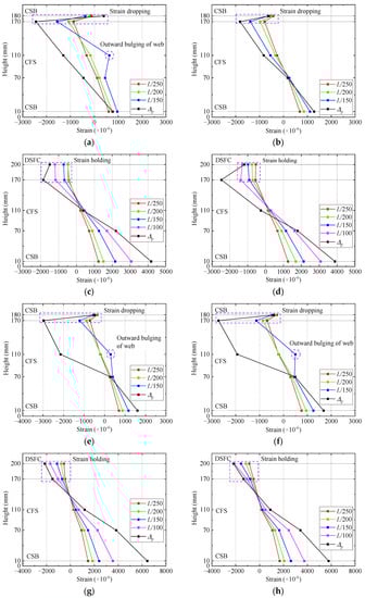 The strain distribution of the side sections at mid-span for each specimen is summarized in Figure 14. The following conclusions can be drawn by observing the mid-span strain distribution: