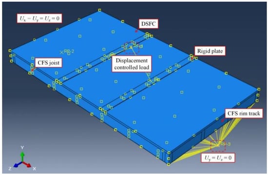 The embedded element technique was used to model the bonding contact between CFS and DSFC. The simply supported boundary conditions were adopted by restraining the corresponding displacements of the rim track bottom flange in the x, y, and z directions at one support, and restraining the displacements in the y and z directions at the other support. In addition, two rigid plates coupled by a reference point were built to apply load controlled by displacement to zones under the spreader beams, and a general contact interaction procedure was used with normal behavior (“hard” formulation) to avoid intrusion between units. Figure 15 illustrated the details of the FE model.