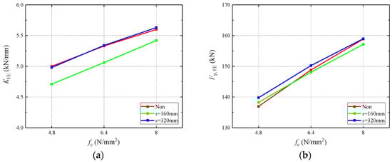 As indicated in Table 9 and Figure 19, the increase in the strength of foamed concrete resulted in improvements in both the stiffness and flexural capacity of the composite floor. The improvement in foamed concrete strength made the neutral axis move upward, increased the modulus of the flexural section, and improved the flexural behavior; on the other hand, it also improved the restraint effect on the local buckling of CFS joists. Regardless of the hole spacing, both the flexural stiffness and ultimate capacity were enhanced by nearly 15% when the foamed concrete strength increased from 4.8 to 8.0 kN/mm2.