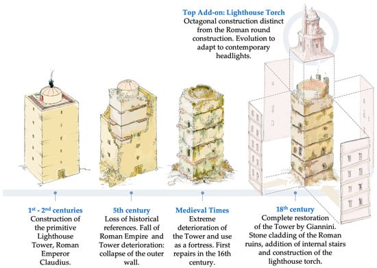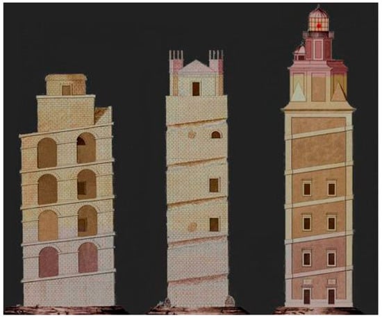 Figure 2, taken from an engraving from the end of the 18th century, shows the historical evolution of the lighthouse, with the first elevation of the Roman Farum Brigantium in which the central body can be seen surrounded by a perimeter ramp supported in turn by a second wall that surrounded the complex and that today has completely disappeared. A cylindrical lantern, covered by a vault with an oculus in its central area, houses the fire in its upper area. The engraving (Figure 2) is based on representations of other Roman lighthouses, although it is very possible that the sizes of the openings in the façade were much smaller and that they were linteled. Some authors [22,23,34,38] believe it possible that the width of the tower was divided vertically into three unequal cubic bodies that slightly decreased with the height so that its external appearance would be staggered.