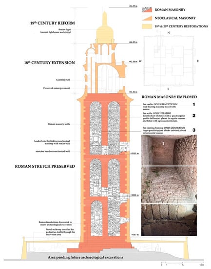 The visible faces of the internal walls of the lighthouse are made of banded masonry (opus vittatum) of 30-cm thick white granite (Figure 6 and Figure 15). The core of the walls was filled with a concrete of sand, lime, and large unworked stones (opus caementicium), making the structure very strong, with a thickness of approximately 90 cm (Figure 6 and Figure 15). The exposed surface of opus vittatum is made up of granite ashlars in horizontal courses, which are regularized every five to seven courses (between 90 and 120 cm high) corresponding to the compaction of the layers of concrete with which the interior was filled. The exterior opus vittatum constitutes, then, an exterior finish and a lost formwork for the interior opus caementicium [23,38,39,40].