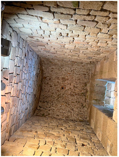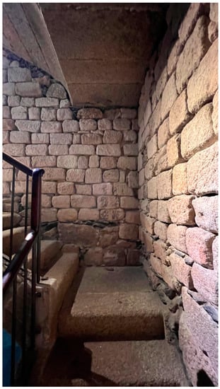 The internal walls have a thickness of 1.5 m. It is the same width as the original perimeter walls of the preserved nucleus of the Roman masonry. After Giannini’s works, the thickness of the perimeter walls was greater (2.15 m), because they were clad on the outside with a new ashlar wall (Figure 5). We must remember that the Roman structure was covered and attached to that cladding by perfectly fitted header stones (sooty ashlars [38]). Almost all the openings from the Roman period (doors and ventilation windows) that were in this wall were respected by the new neoclassical work (Figure 14).