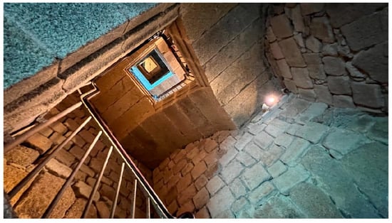 The ruined parts of the lighthouse were used as a stone quarry for the construction of the city. The value of its granite stone is the fundamental cause of this looting. In the 16th century, plundering was prohibited. After this, in the second half of the 16th century, an internal wooden staircase was also built, providing access to the lighthouse lantern through the chambers, as the former exterior ramp had completely disappeared (Figure 2 and Figure 3).