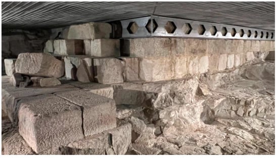 In this way, the original structure was maintained and preserved for posterity, even though its appearance was changed. The intervention respected the preserved Roman ruin, as it is a unique testimony of ancient engineering [34,38]. This admiration for what was built conditioned the intervention: in fact, some small black stones were introduced to mark the limits of the restoration, making it possible to identify the points where the original structure was modified (Figure 8).