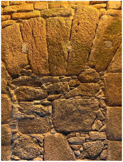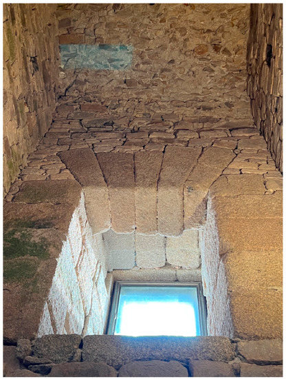 The exterior walls were made (or should have been made) of cyclopean granite ashlars, also combined with running bond, of which a small amount has been preserved that presents rough padding on its visible face from the outside. The data on the arrangement of the holes in this wall are unknown. The approximate length of the facades would be 18 m, and the width of the interior ramp could be around 2 m, a span that could have been covered with vaults with characteristics similar to those existing inside. Some authors [22,23,34,38] comment on the possibility that the ramp had slopes only on two opposing faces. If so, on the other two faces it would be horizontal. This does not seem to agree with the marks that existed on the facades before their restoration.