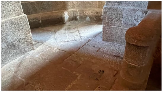 The pavement is made up of slabs made with large pieces of granite carved in the shape of a double T (Figure 17), which are placed and assembled using a chained seaming system following the direction of the walls. The central piece of this bundle is located at the intersection of the axes of the walls that form the cross and has the shape of two inverted crosses with their trapezoidal arms. In Figure 17, made in the room of the first neoclassical octagonal body, we can observe the shape and placement of the pieces of this flooring, including the detail of the central slab.