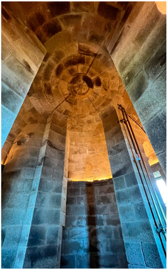 Inside, Giannini respected the configuration of the four superimposed vaulted chambers on three levels of the Roman construction (Figure 3, Figure 6 and Figure 10). Making the climb to the lantern comfortable and functional was a necessity. The vaults were pierced to make way for a more comfortable stonework staircase (Figure 11 and Figure 12), replacing the one that Amaro Antúnez had built. The Roman rotunda that was still preserved (albeit heavily modified) was demolished to modernize the signaling system of the lighthouse. Not being able to take advantage of the existing structure, a new innovative composition was designed, based on the superposition of two octagonal bodies. Once the works were finished, the two bronze plates that commemorate the restoration of the lighthouse were placed on the access doors to the tower (Figure 9).