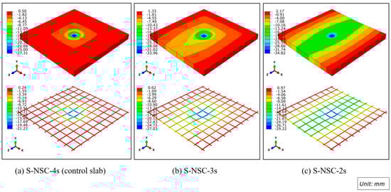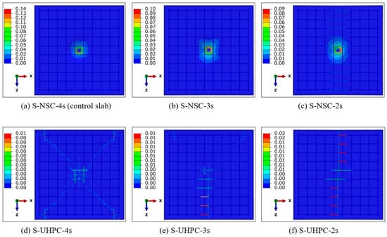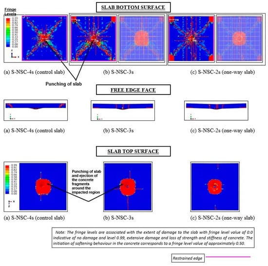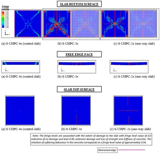 - Damage in the form of the detachment of cover concrete at the corners consisting of free edge(s) of the slabs S-NSC/UHPC-3s and S-NSC/UHPC-2s occurs due to impulsive reaction at such corners, which makes the steel bars exposed. These slabs undergo severe diagonal cracking and de-bonding in the flexure zone as compared to the slab S-NSC/UHPC-4s.