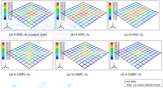 - Domination of the flexure in the slab S-NSC/UHPC-2s indicated by maximum tensile stress in the steel re-bars supplemented by their maximum displacement under the impacted area shows that damage due to shearing of concrete in this slab is less than that of the slab S-NSC/UHPC-3s. This is why the damage to the slab S-NSC/UHPC-3s is maximum.