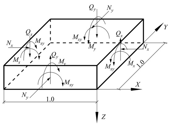 In order to provide an acceptable approximation of the real working conditions, the selected unit volume of the concrete element is divided into a number of layers or plates (Figure 2), on which the normal forces (N), transverse forces (Q), bending moments (Mx, My), and torsional moments (Mxy)—which are not conditionally shown, so as not to complicate the figure—act.