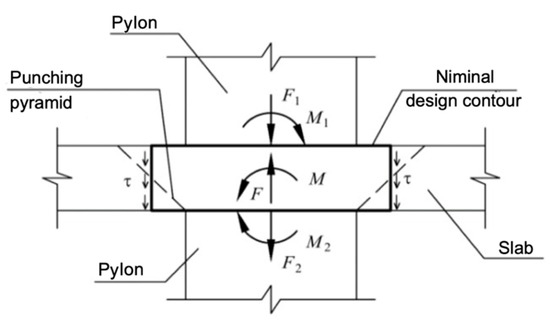 For the punching shear calculation, the cross-section around the force transfer area of the concrete element is considered at a distance of normal to its longitudinal axis, with tangential forces acting on its surface (Figure 3).