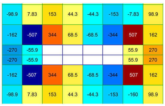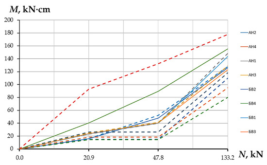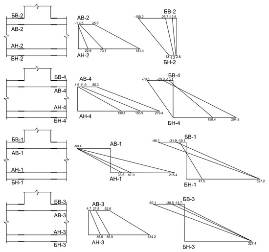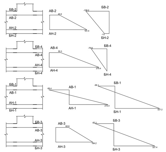 The finite element model revealed the presence of force concentrators at the pylon’s corners (see Figure 19 and Figure 20), which is confirmed by the results of experimental studies [4,22,25,26,27]. It is also observed that the concentration intensity of forces at the corners of the pylon is directly related to the geometric parameters of the support element (in particular, the aspect ratio of the pylon). As the size increases at one of the pylon’s sides, the concentration of forces increases at the corners; however, closer to the centre of the long side, the punching force decreases.