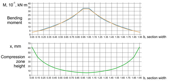 The contour is divided into three sections (1,2, and 3). The average forces along the length of the sections are determined by the Lira CAD 2021 R2 Update 3.1 software. The values of the averaged bending moment diagrams on the long opposite segments 1 and 3 are equal and do not affect the load-bearing capacity (pylon width а = 200 mm; side length = 800 mm, 1000 mm, 1200 mm, 1400 mm, and 1600 mm). The thickness of the floor slab is h = 200, 400, 600, 800, and 1000 mm. The protective layer of the upper reinforcement mesh is 30 mm. The concrete classes are C25 () and C40 ().