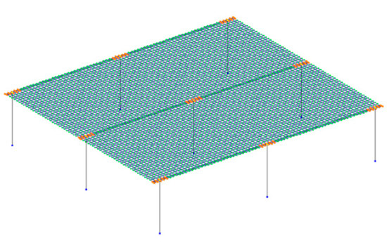 To avoid specifying the pylons as 3D finite elements and to avoid exporting the calculation results, the pylons are modelled with rod finite elements in the form of absolutely rigid bodies that pass through the pylon axes. With their help and by combining the displacements of some plate nodes, the pylons’ support contours are set.