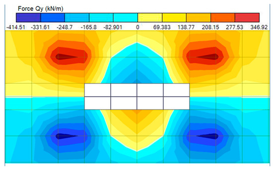 where Qy1, Qx2, and Qy3 are averaged stress values at Section 1, Section 2 and Section 3, calculated by Lira-CAD (see Figure 22 and Figure 23).