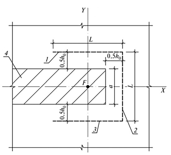 - —area of the design cross-section of the concrete at a distance of 0.5 h0 from the boundary of the application area of the concentrated force F with the working height of section h0, which is determined by the equation: