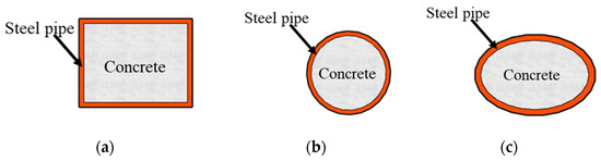 The section shape of the steel tube affects the restraint of the steel tube on the concrete, thus affecting the bearing capacity of the concrete-filled steel tube. At present, the most studied section forms of concrete-filled steel tubes at home and abroad are mainly circular, rectangular, and elliptical, as shown in Figure 3. The slenderness ratio of concrete-filled steel tubular columns is generally between 1.5 and 8.0.