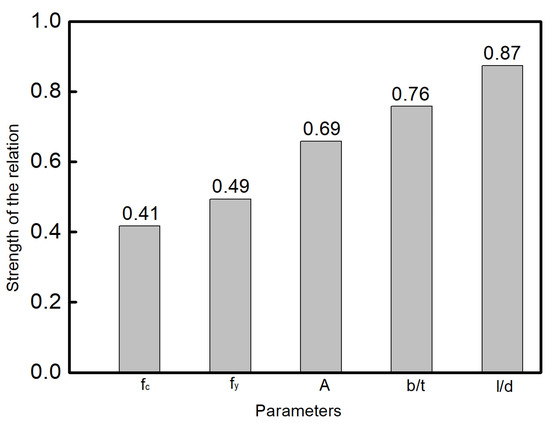 The r value between each influencing factor and the bearing capacity is shown in Figure 4. The figure shows that l/d has the greatest impact on output parameters, followed by b/t. A ranks third, followed by fy and fc.